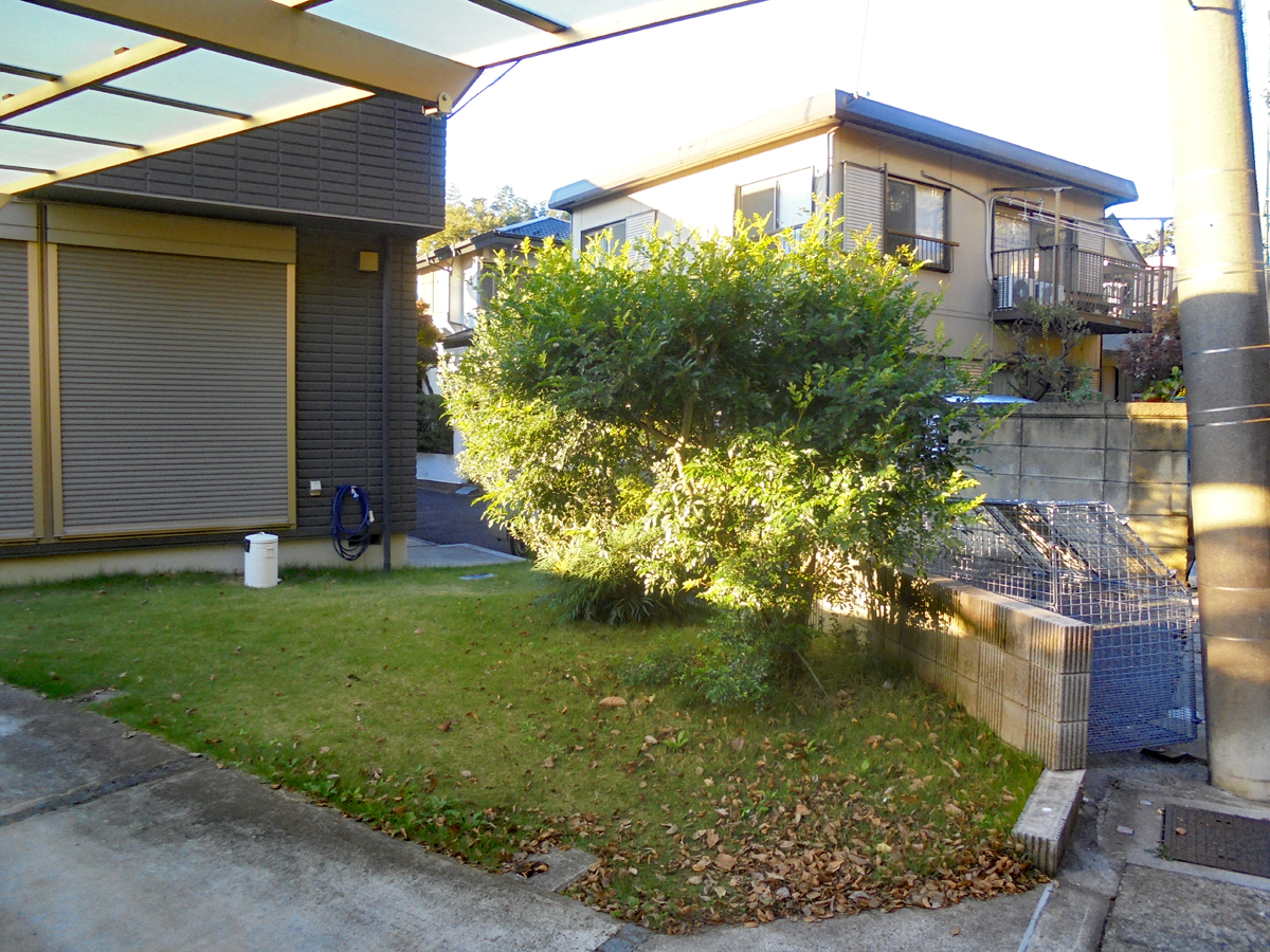 玄関ポーチ横から外の視線が気になることと、お庭の既存のシマトネリコの管理が大変なのでなくしたいとのご相談をいただき、エクステリアリフォームを行うことに。