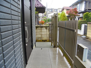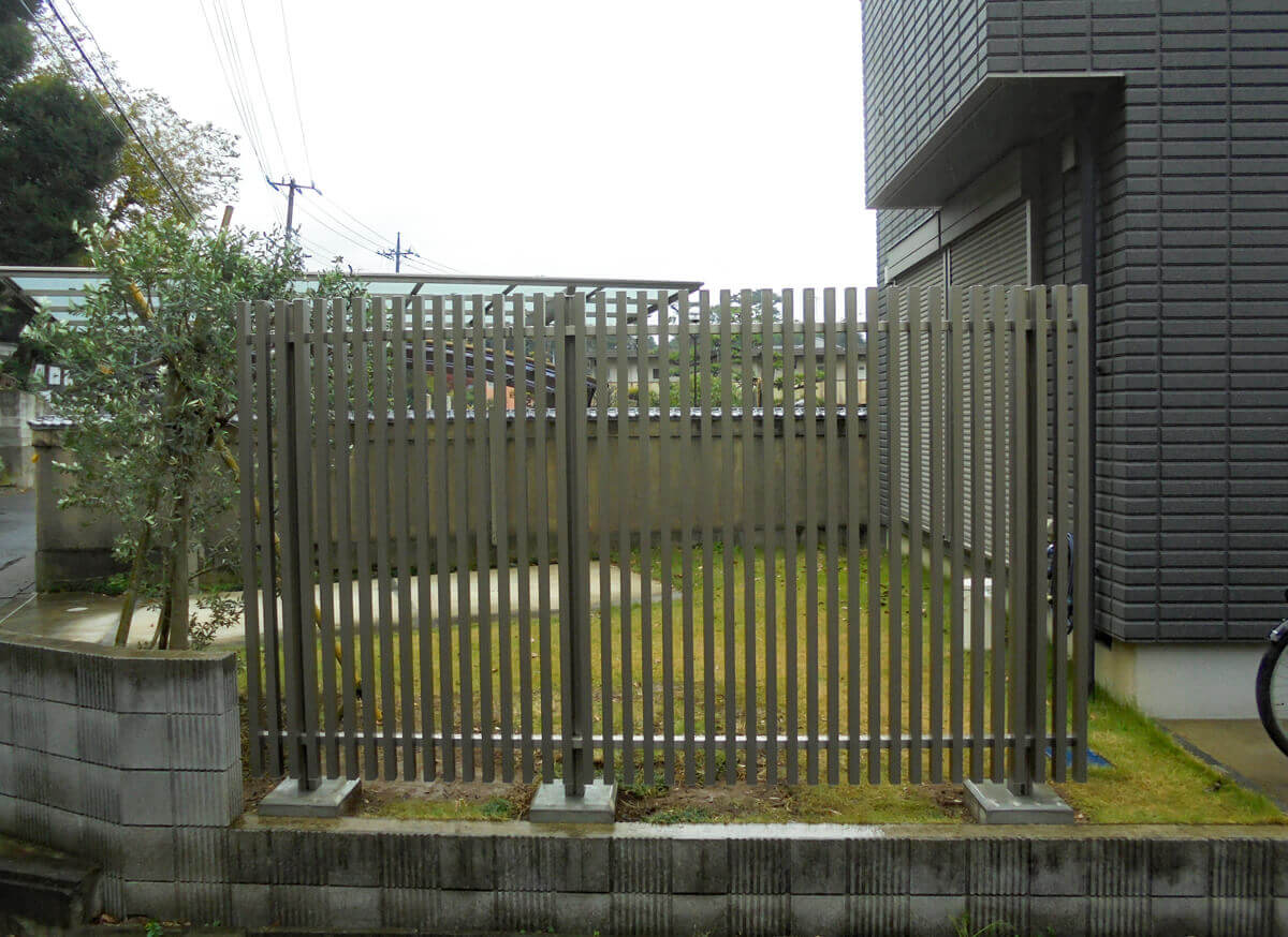 玄関ポーチ横の土のスペースに土間コンクリートを新たに打設し、既存の玄関ポーチ上の縦格子フェンスのデザインを壊さぬよう、似たデザインの『エルファード 片面タイプ1型』を設置。