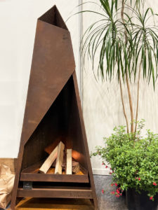 さびた鉄の味わいを楽しむファイヤープレイス。