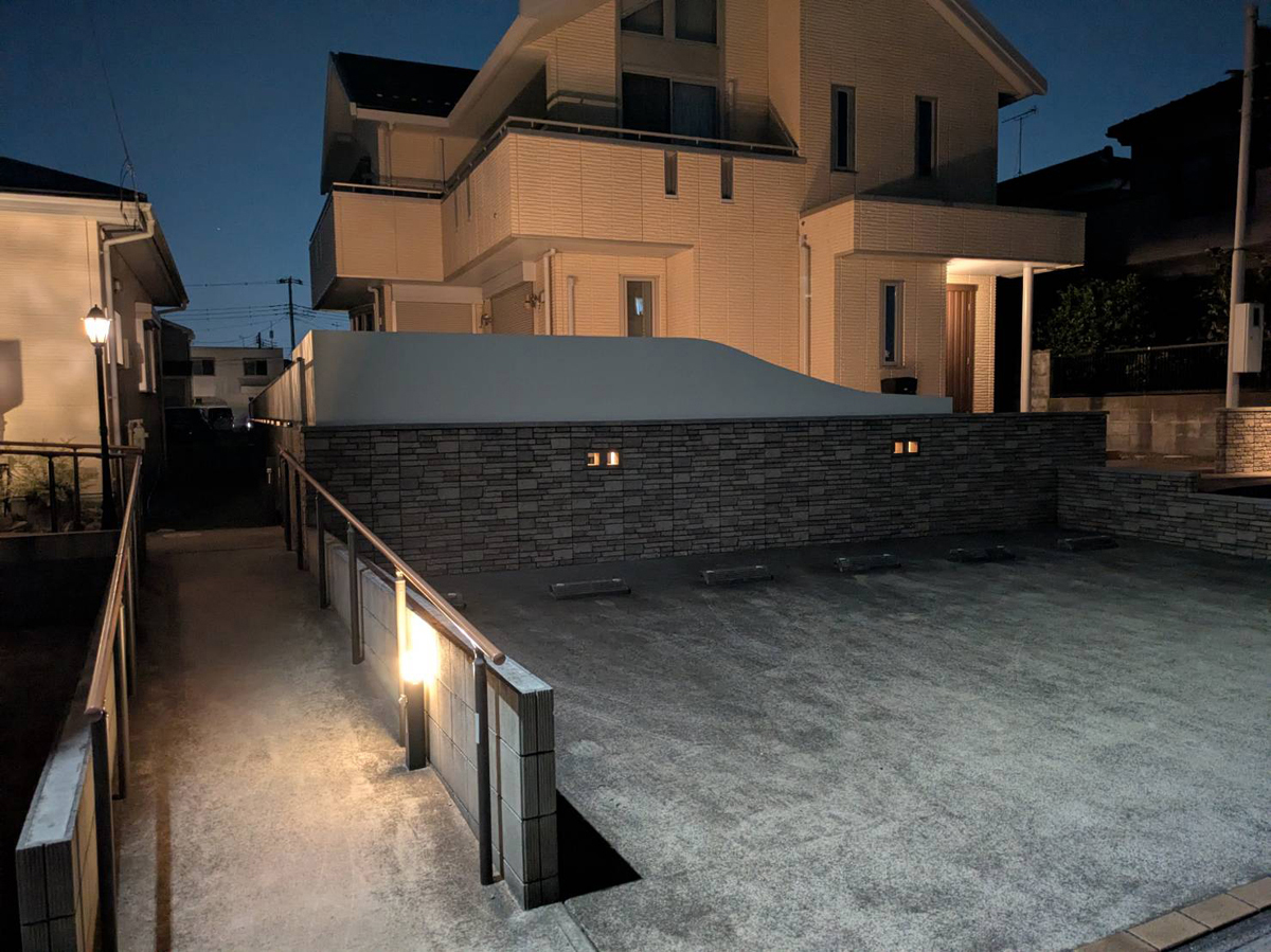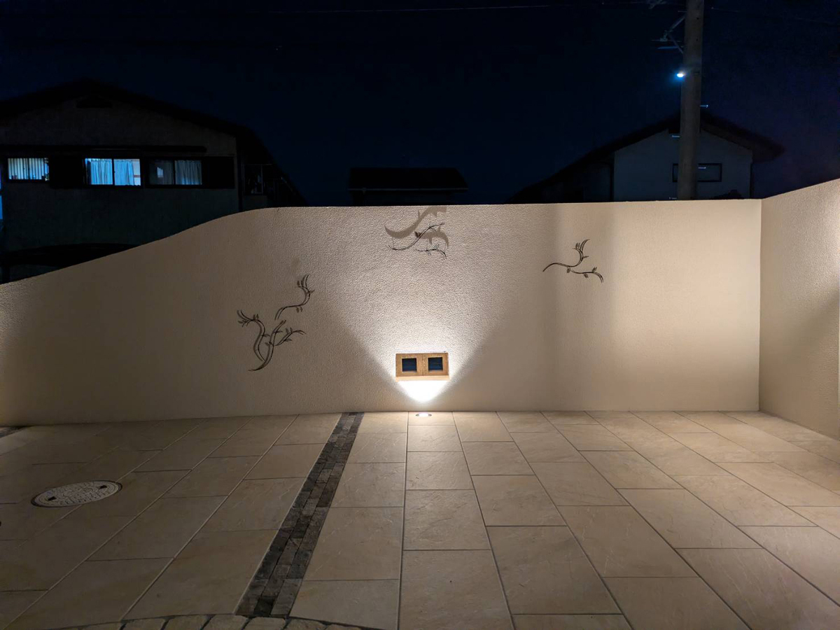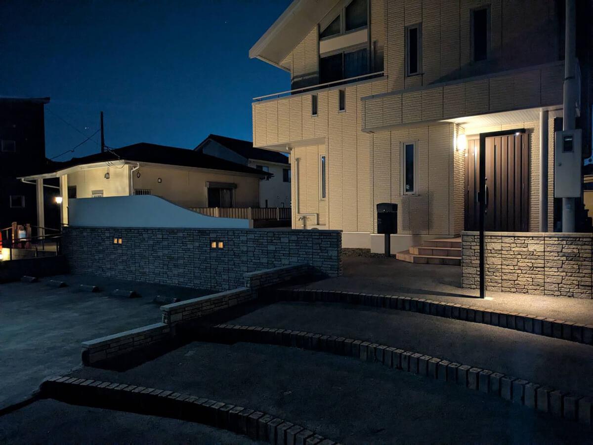 光源そのものを主張させず、壁面の陰影だけをそっと浮かび上がらせることで、夜のアプローチに落ち着きと安心感を添えるライティングになりました。