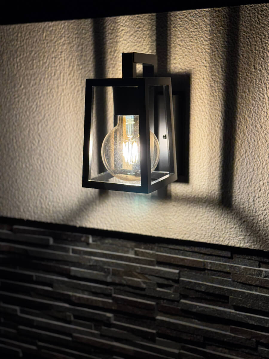 壁面に柔らかく広がる光と、フレームが描き出す繊細な影が印象的なウォールライト『OG254871LC』は、直線的なブラックフレームとクリアガラスの組み合わせが、モダンな外観に上質なアクセントを添えています。