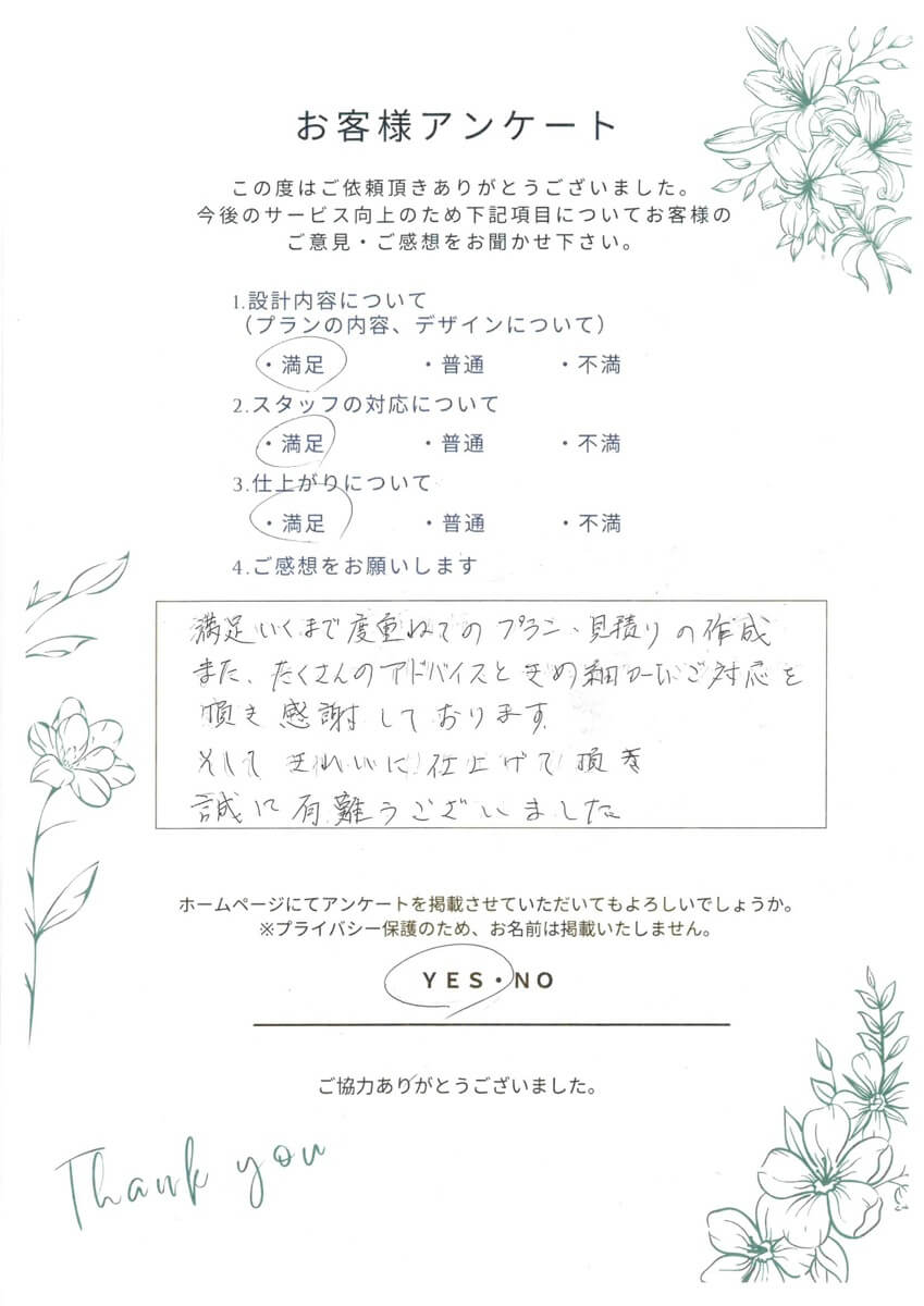 満足いくまで度重ねてのプラン、見積りの作成、また、たくさんのアドバイスときめ細かいご対応を頂き感謝しております。